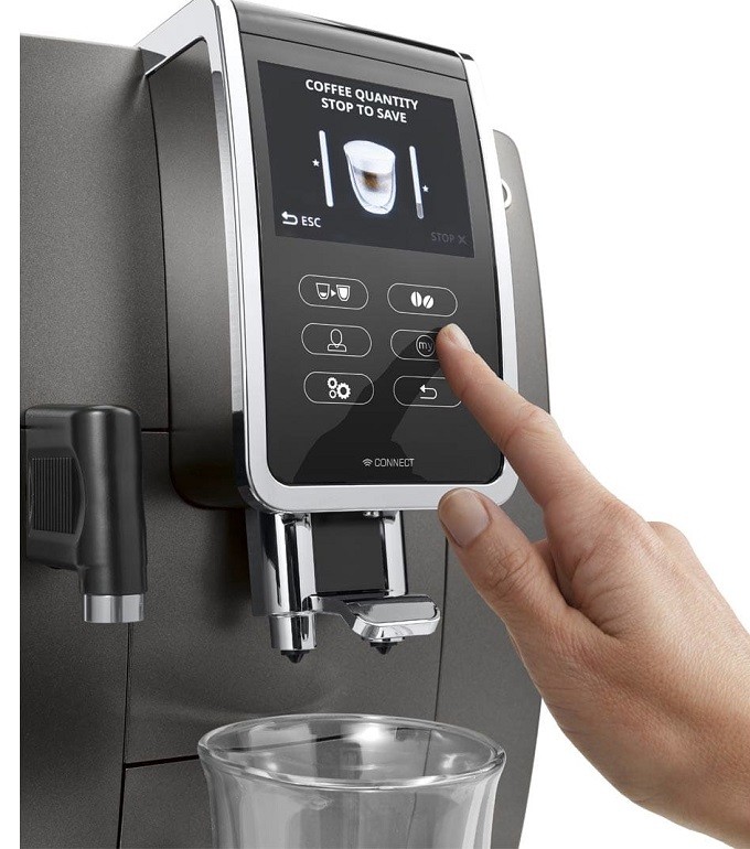 Delonghi a fourni un travail sur l’ergonomie de sa machine pour que les possibilités de personnalisation ne nuisent pas à la facilité d’utilisation. Car en multipliant les réglages possibles, le risque est de rendre l’utilisation fastidieuse, obligeant l’utilisateur à naviguer au sein de menus en jonglant avec le panneau de commande. Delonghi a donc pourvu la Dinamica Plus de commandes tactiles et d’un large écran numérique (TFT) en couleur. En effleurant une seule touche, on accède à toutes les boissons disponibles. Le large écran de 3,5 pouces (soit presque 9 cm de diagonale) procure un grand confort d’utilisation.