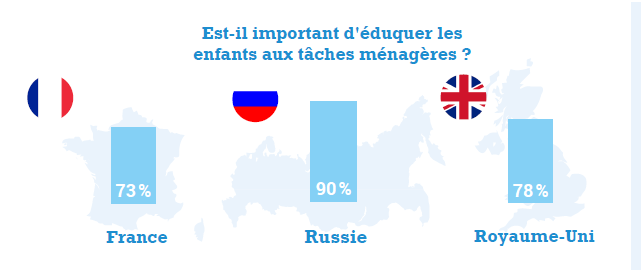 Si les parents reconnaissent volontiers qu’il est important d’impliquer leurs enfants dans la réalisation des tâches ménagères, dans les faits, ces derniers en assument assez peu. En France, ils prennent part à 6% des tâches du foyer, quand leur mère en assume la majorité (63% des tâches).